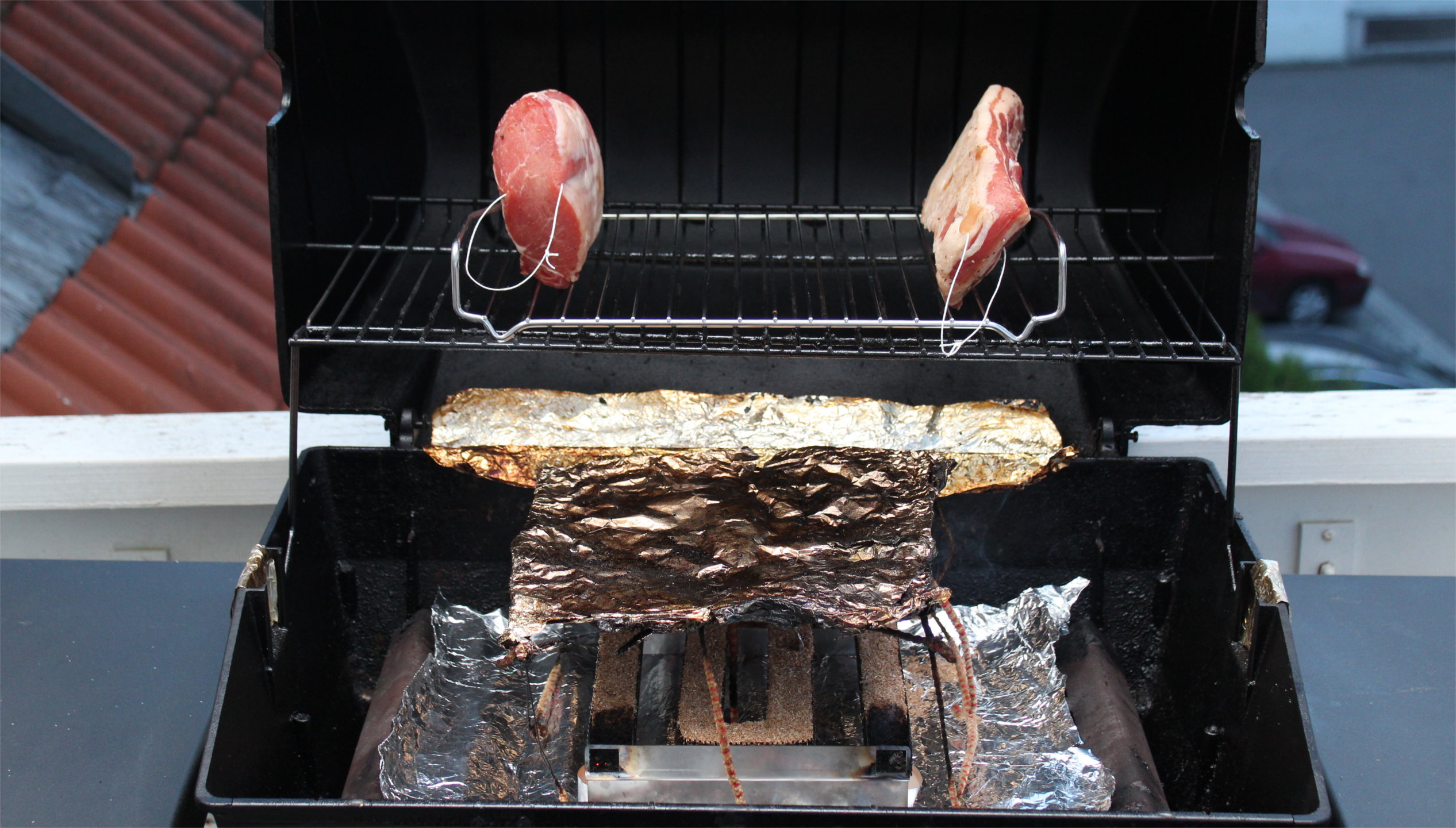 Für den Räuchergang hängt ihr den Schinken in den Räucherofen bzw. legt ihn auf den Ablagerost eures Grills. Wichtig ist hierbei nur, dass sich die Stücke nicht berühren und dass möglichst überall Rauch rankommt.