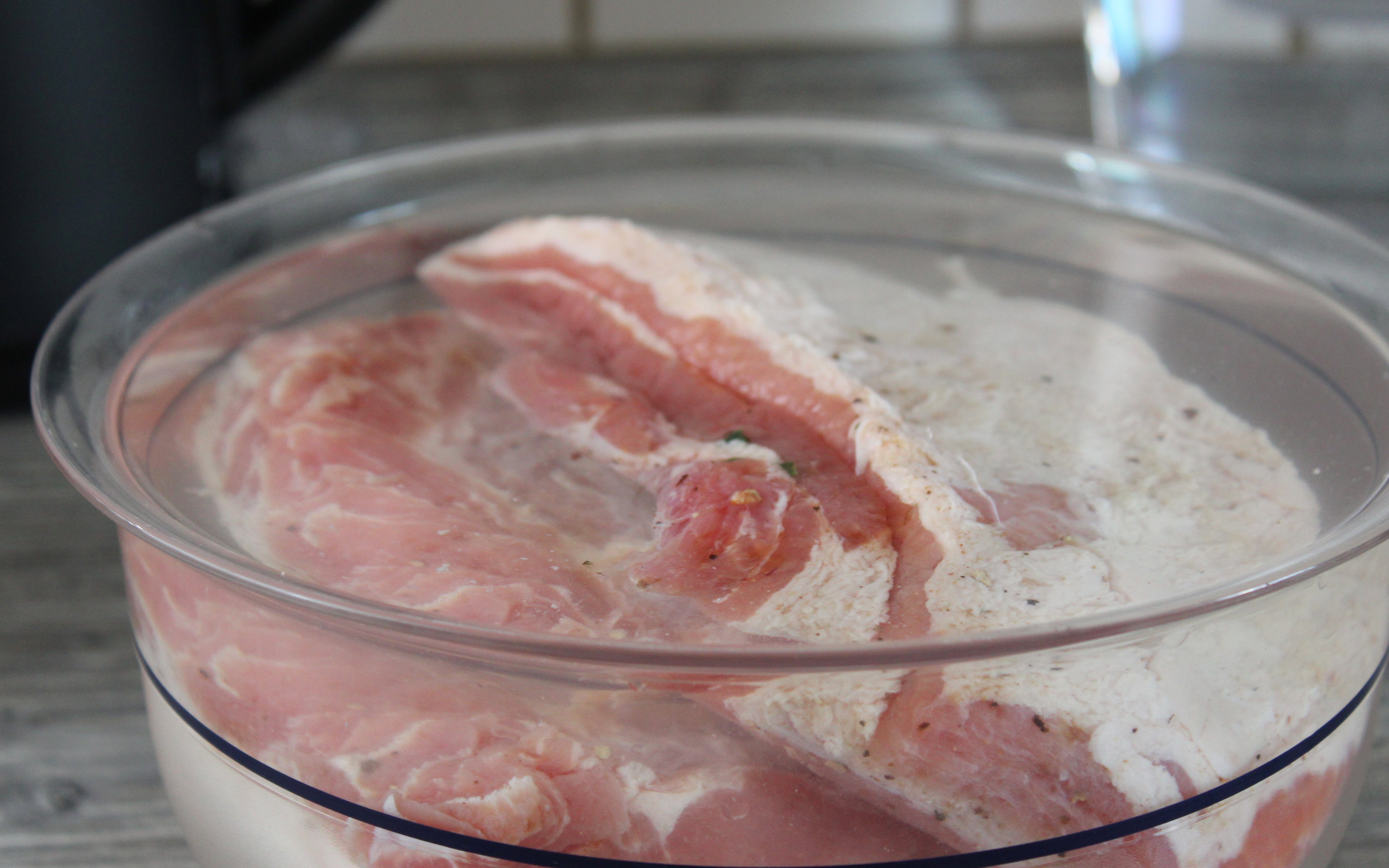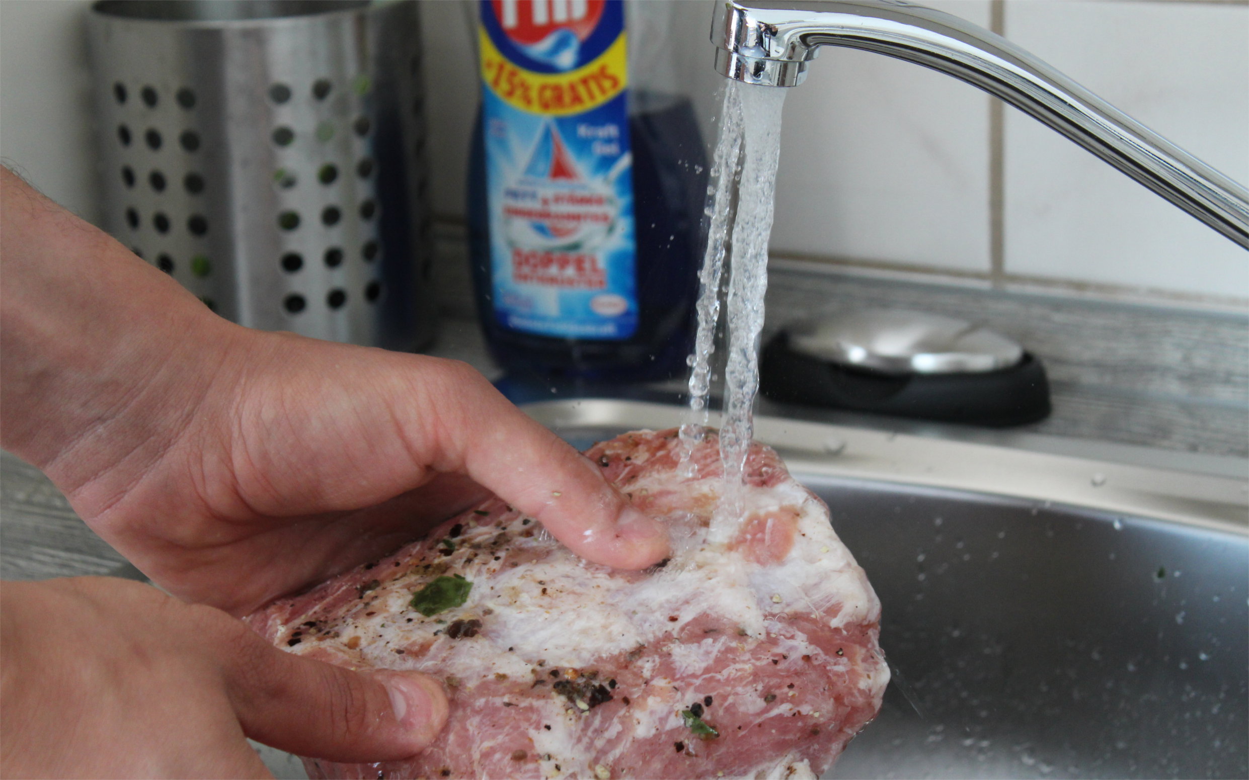 Ihr entnehmt das Fleisch aus dem Vakuumbeutel und wascht die Pökelmischung mit kaltem Wasser ab. Anschließend legt ihr das Fleisch in eine große Schüssel mit frischem, kaltem Wasser und wässert es so 30 – 45 min. Hierdurch wird der Salzgehalt am Rand etwas abgesenkt.