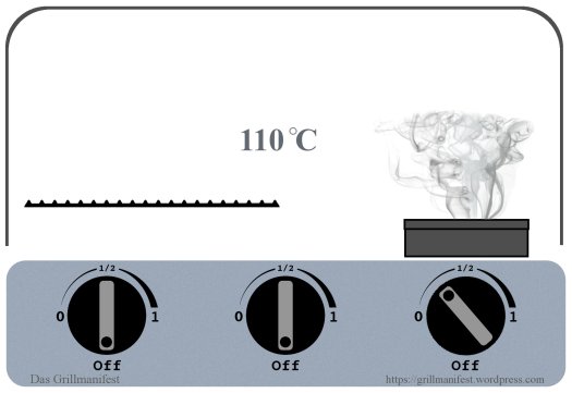 Bereitet den Grill für indirekte Hitze zum Smoken vor. Die angestrebte Garraumtemperatur ist 110 °C. Aber alles zwischen 100 und 120 °C geht in Ordnung. Ich überwache die Garraumtemperatur gern mit meinem Maverick ET-733 Funkthermometer. Ich stelle einen GN-Behälter mit kochendem Wasser mit auf den Grill. Das dämpft die Temperatur etwas, sorgt also für geringere Temperaturschwankungen.