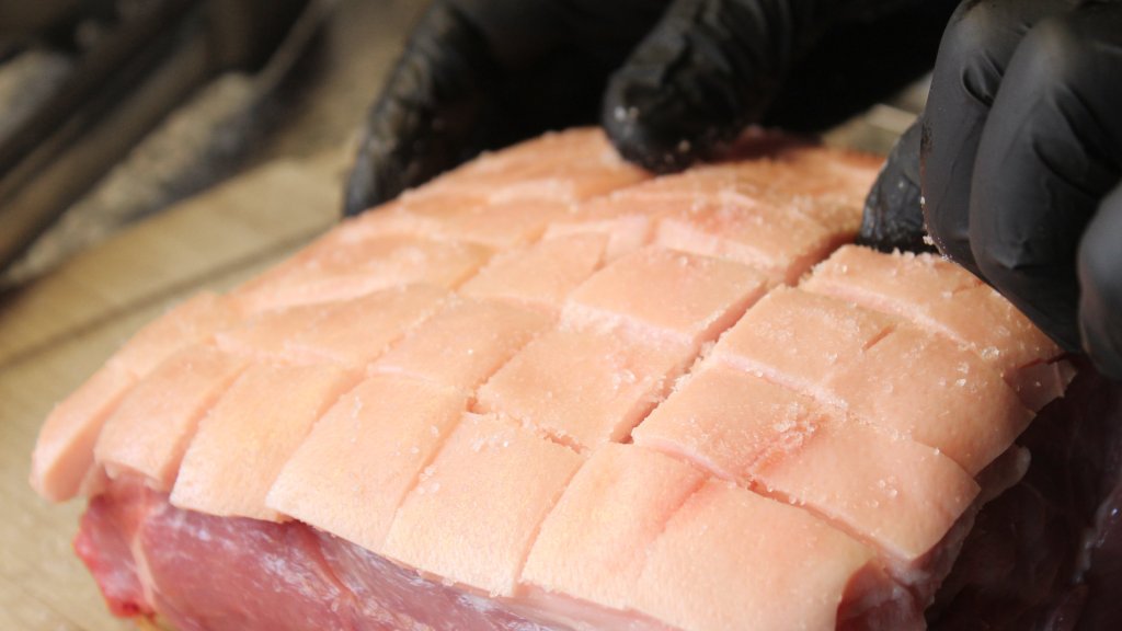 - Einreiben mit Salz: Hier wird die Schwarte mit einem scharfen Messer meist rautenförmig eingeschnitten und mit einer guten Portion Salz gewürzt.