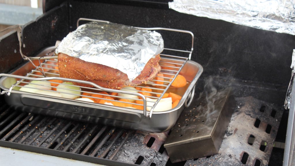 Krustenbraten am Smoken, die Kruste ist mit Alufolie abgedeckt