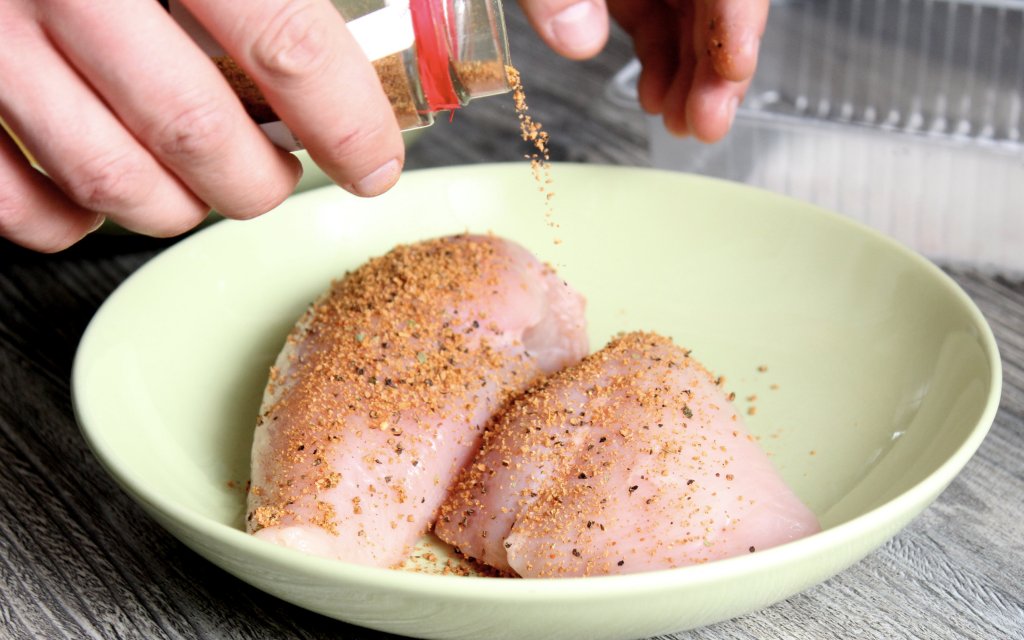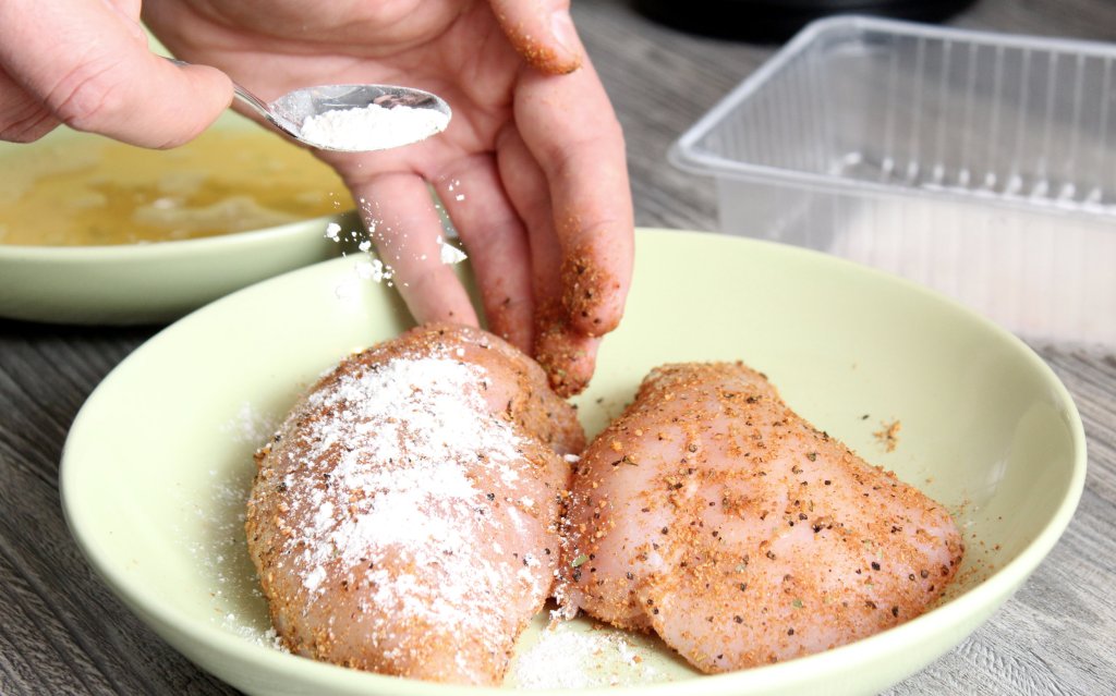 Würzen und Panieren des Hähnchens