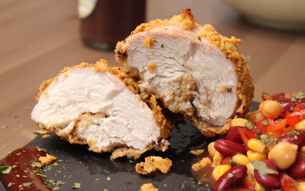 Angerichtetes Hähnchen mit Cornflakes-Panade