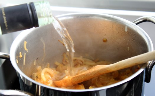 Schneidet dann die Zwiebeln in Ringe und bratet sie in etwas Öl kräftig an. Wenn die Zwiebeln etwas mehr als glasig sind, gebt etwa 2 EL Zucker dazu, rührt gut durch und lasst den Zucker karamellisieren. Danach löscht ihr die Zwiebeln mit einem guten Schluck Wein ab und lasst das Ganze einkochen. Wiederholt das Ablöschen und Einkochen so lange, bis ihr mit dem sämigen Ergebnis zufrieden seid.