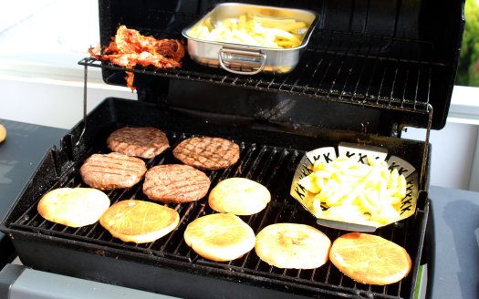 Die Burgerpattys, Buns und Bacon werden direkt gegrillt. Hier reicht bei den meisten Grills halbe Kraft. Ein Deckel ist hierfür nicht unbedingt erforderlich.