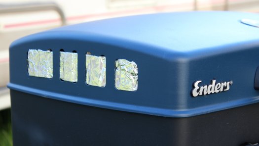 In den Kommentaren zu meinem Test-Beitrag gab es den einen oder anderen Vorschlag, jedoch ultimativ praktikabel schien mir keiner davon. Dann kam ich auf die Idee: Die Schlitze laden ja förmlich dazu ein, einen mehrfach gefalteten Alufolie-Streifen einzuweben. Auf den folgenden Bildern könnt ihr sehen, wie ich das gemacht habe. Das Ergebnis hat mich überzeugt: Selbst bei etwas mehr Wind erreicht der Enders mit Leichtigkeit 300 °C laut Deckelthermometer. Auftrag ausgeführt würde ich sagen.