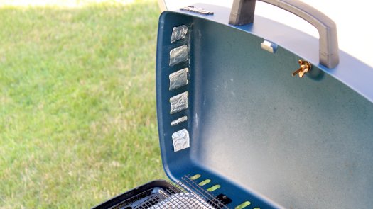 Lange habe ich überlegt, wie die aus meiner Sicht völlig überflüssigen seitlichen Öffnungen im Deckel verschließen kann. Denn sobald nur etwas Wind geht, in der Grill kaum noch zum indirekten Garen zu gebrauchen, weil sämtliche warme Luft sofort herausgetragen wird.