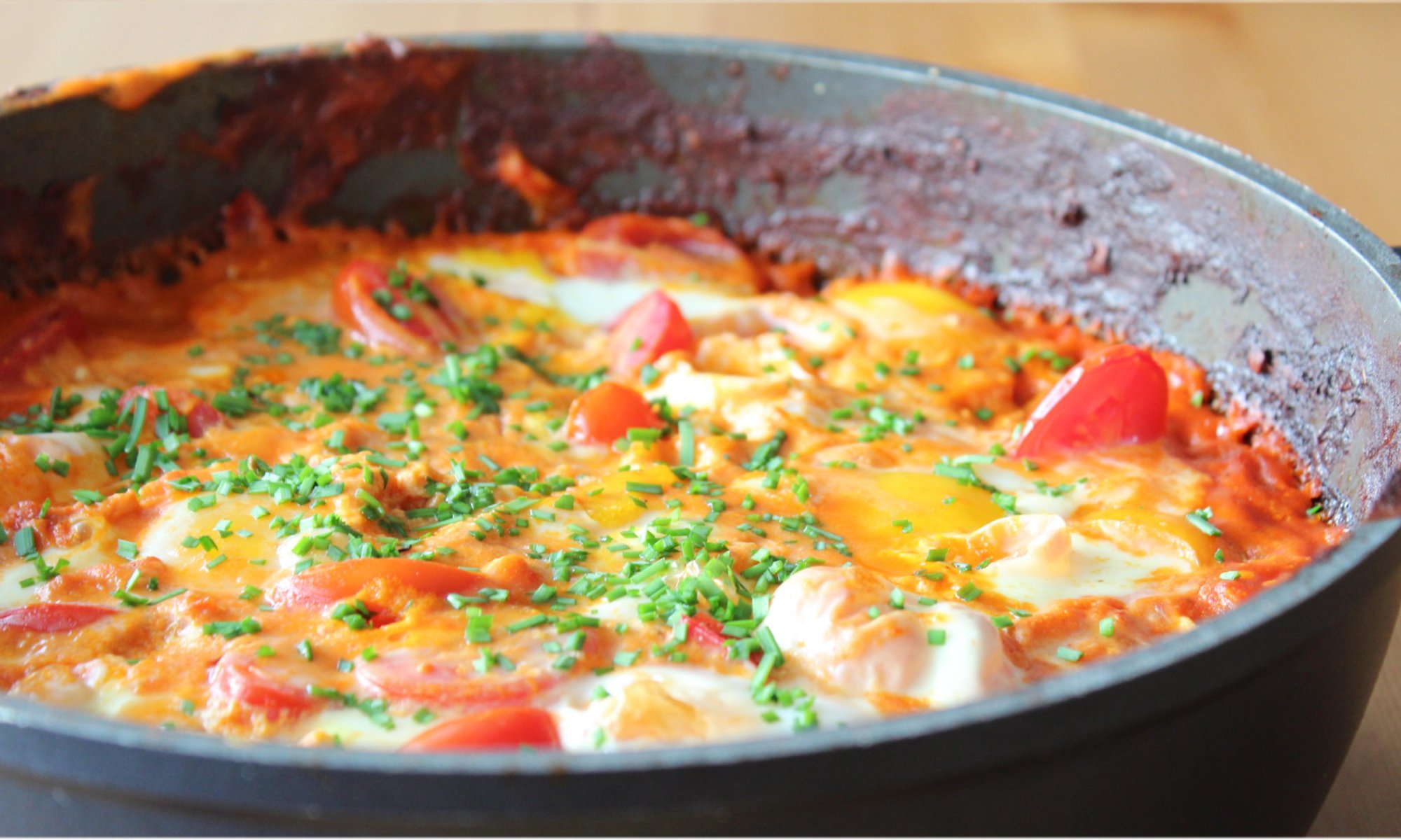 Wer an israelische Küche denkt, denkt an Hummus und Falafel, nicht so bekannt hingegen ist Shakshuka. Ein wunderbares Pfannengericht mit viel Gemüse und Eiern, das mit Brot aus der Pfanne gedippt wird. Es ist auch recht schnell gemacht, das aufwändigste daran ist das Einkaufen und Kleinschneiden der Zutaten.