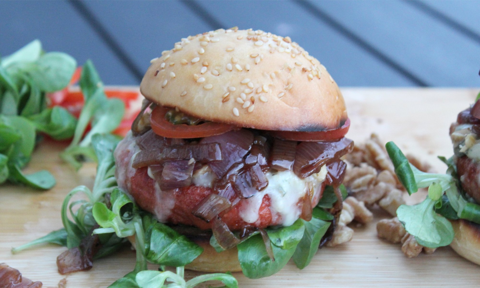 Burger mit Veganpatty, Gorgonzola, Walnüssen und Portweinzwiebeln